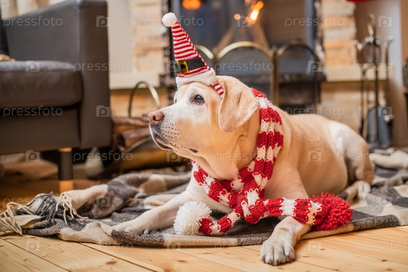 Золотой лабрадор-ретривер в рождественском шарфе лежит на пледе в деревянном доме возле горящего камина