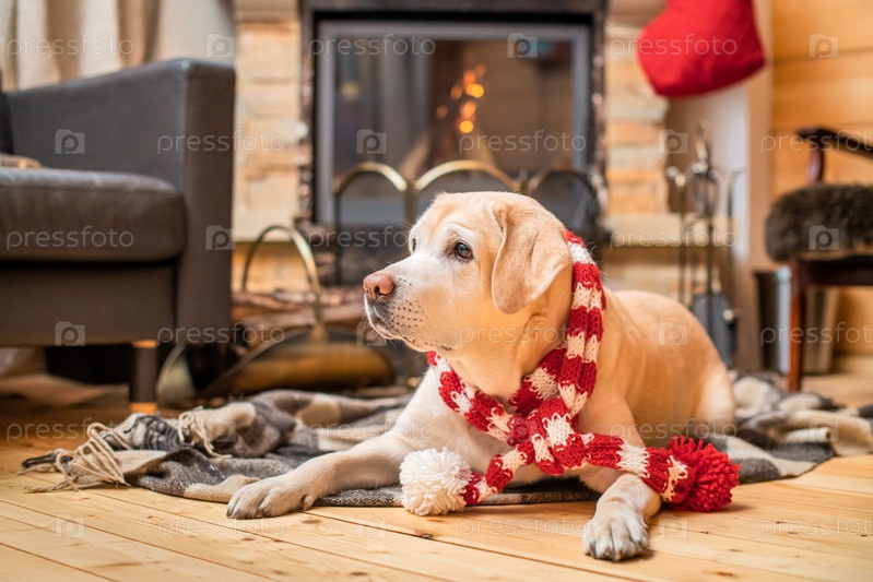 Золотой лабрадор-ретривер в рождественском шарфе лежит на пледе в деревянном доме возле горящего камина