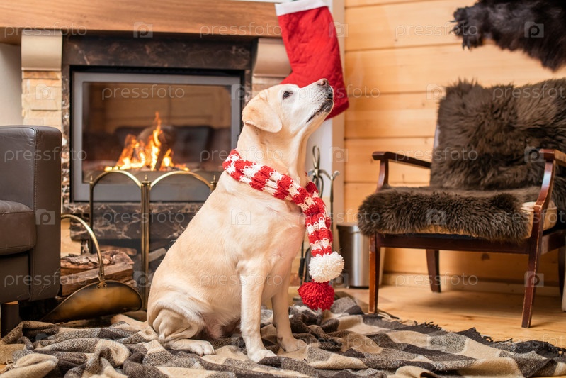 Золотой лабрадор-ретривер в рождественском шарфе сидит на пледе в деревянном доме возле горящего камина