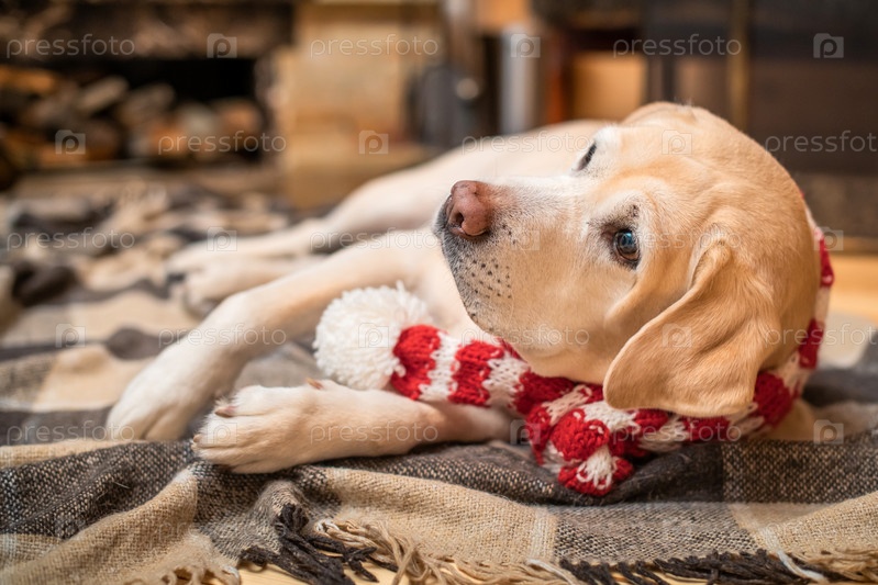 Золотой лабрадор-ретривер в рождественском шарфе лежит на пледе в деревянном доме возле горящего камина