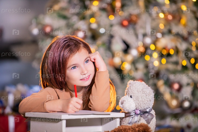 Портрет девушки с большим письмом, пишущим Деду Морозу на фоне елки