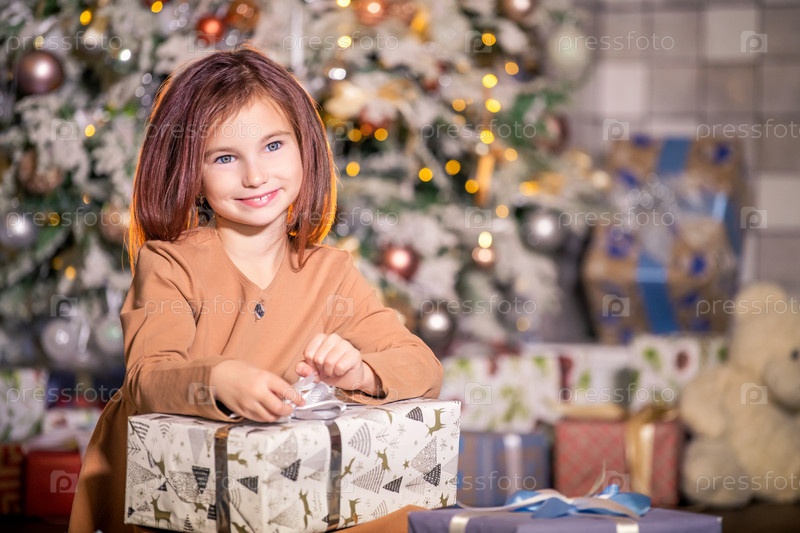 Портрет улыбающейся девушки с большой коробкой с подарком на фоне елки