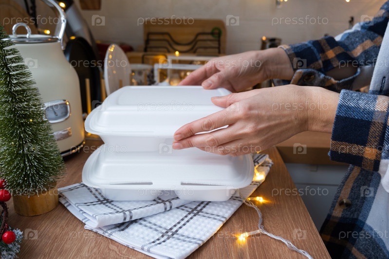 Контейнеры службы доставки еды на столе белая скандинавская праздничная кухня в рождественском декоре. Канун Нового года, экономия времени, лень готовить, горячий заказ, одноразовая пластиковая коробка в сказочном свете. макет