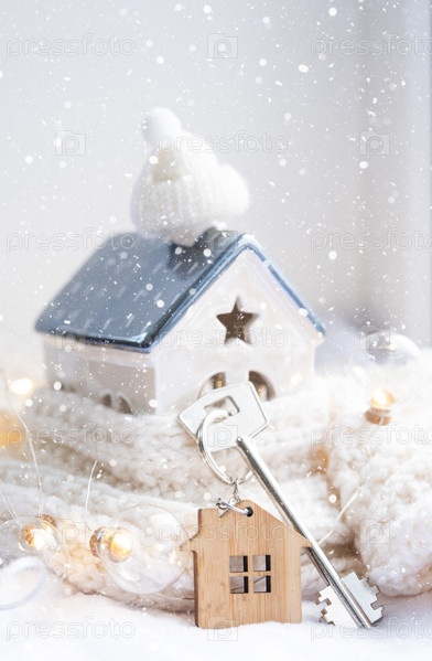 Ключ от дома с брелоком на уютном доме с рождественским декором. Подарок на Новый год, Рождество. Строительство, дизайн, проект, переезд в новый дом, ипотека, аренда и покупка недвижимости
