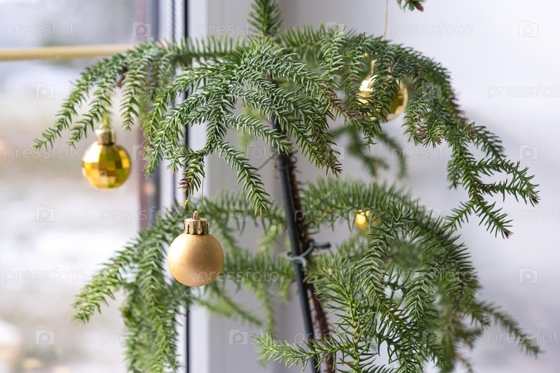Комнатное растение араукария представляет собой комнатную ель, украшенную елочными шарами, как елку у окна. Зеленый декор интерьера дома