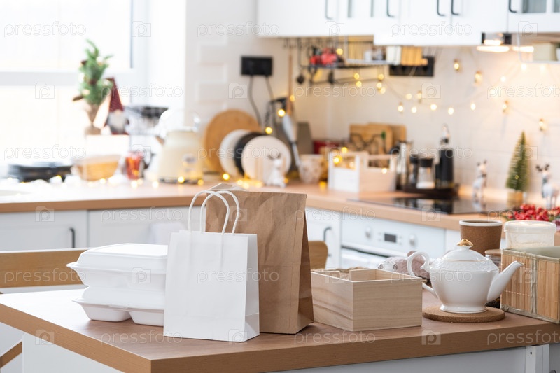 Контейнеры службы доставки еды на столе белая скандинавская праздничная кухня в рождественском декоре. Канун Нового года, экономия времени, лень готовить, горячий заказ, одноразовая пластиковая коробка в сказочном свете. макет