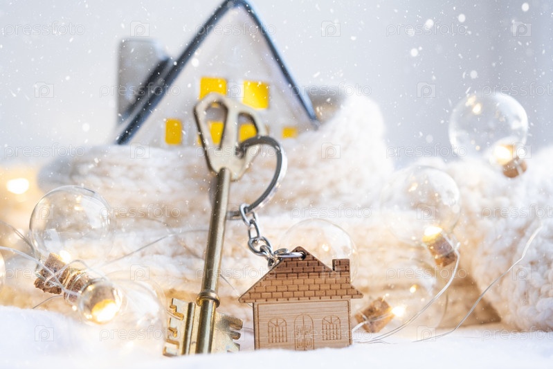 Ключ от дома с брелоком на уютном доме с рождественским декором. Подарок на Новый год, Рождество. Строительство, дизайн, проект, переезд в новый дом, ипотека, аренда и покупка недвижимости