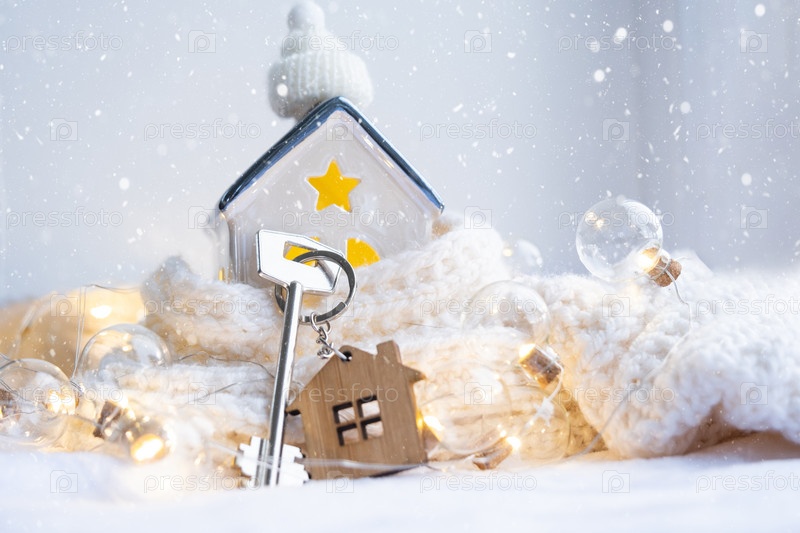 Ключ от дома с брелоком на уютном доме с рождественским декором. Подарок на Новый год, Рождество. Строительство, дизайн, проект, переезд в новый дом, ипотека, аренда и покупка недвижимости