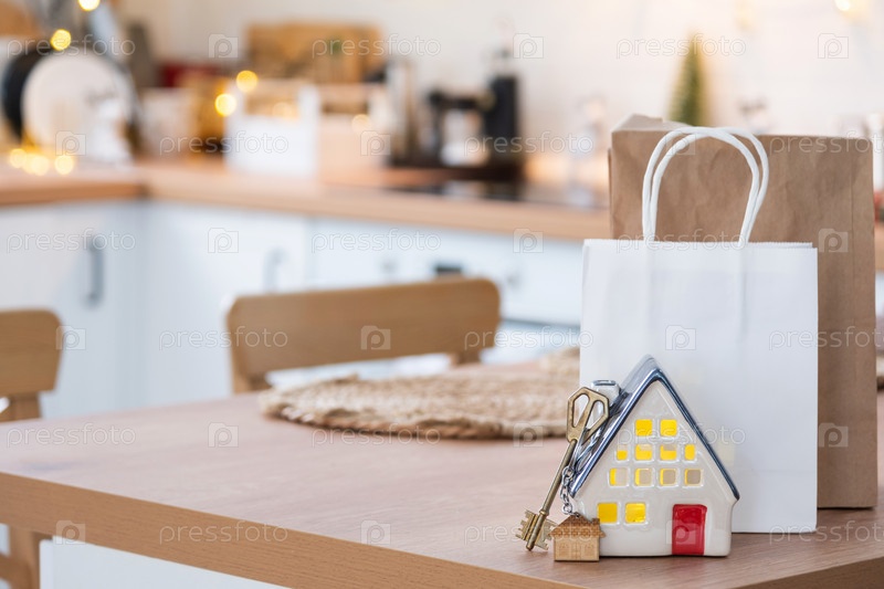 Ключ от дома в уютном доме с рождественским декором и пакетами на столе праздничной кухни. Подарок на Новый год. Строительство, дизайн, проект, переезд в новый дом, ипотека, аренда и покупка недвижимости