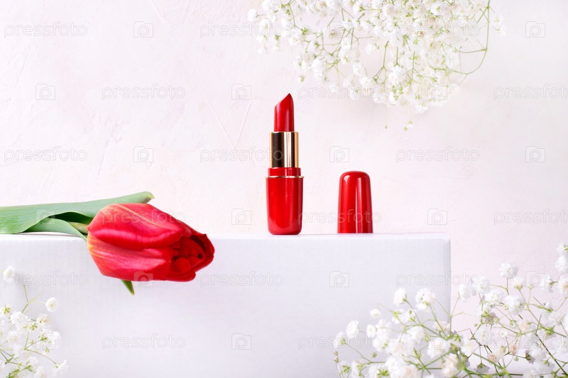 Красная помада и тюльпан на белом подиуме и белые цветы гипсофилы вокруг. Косметический продукт