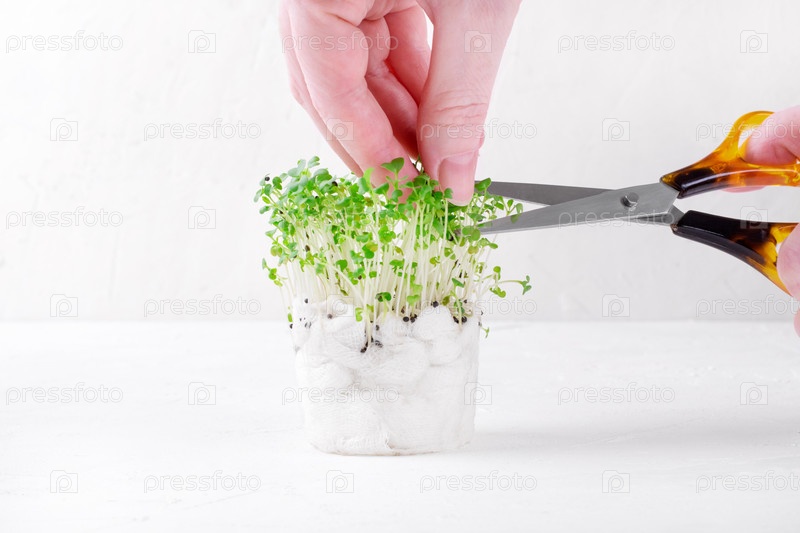 Микрозеленая горчица прорастает на марле. Женщина режет ростки, чтобы добавить в пищу. Проращивание зелени в домашних условиях