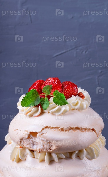Высокий торт Павлова со взбитыми сливками и клубникой на сером фоне. Десерт из многослойного безе