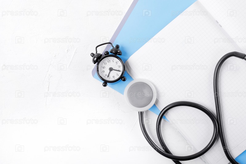Медицинское образование. Стетоскоп, синий блокнот, будильник и пустая страница на белом столе. Время для проверки