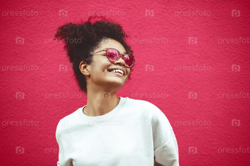 Молодая женщина африканского происхождения в стильных солнцезащитных очках, с вьющимися волосами, собранными в высокий хвост, смотрит в сторону, широко улыбаясь, показывая прямые идеальные зубы