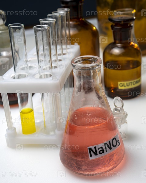 Пищевые добавки в пробирках и колбах на лабораторном столе. пищевая лаборатория