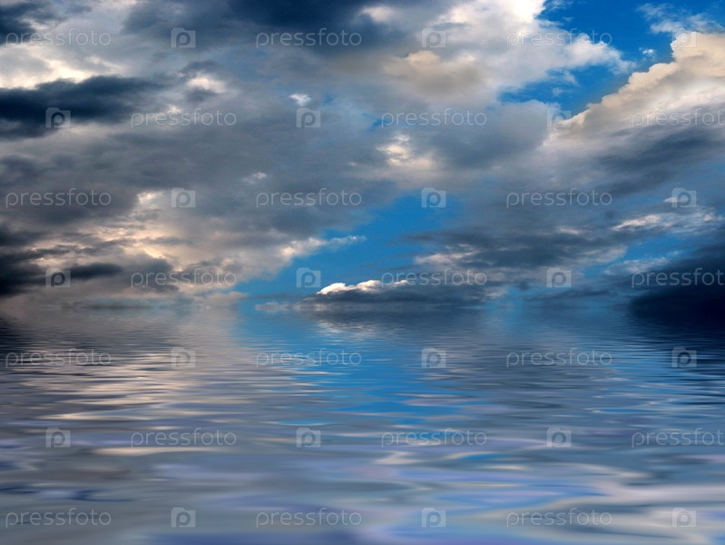 Темные грозовые тучи на закате и спокойная поверхность морской воды
