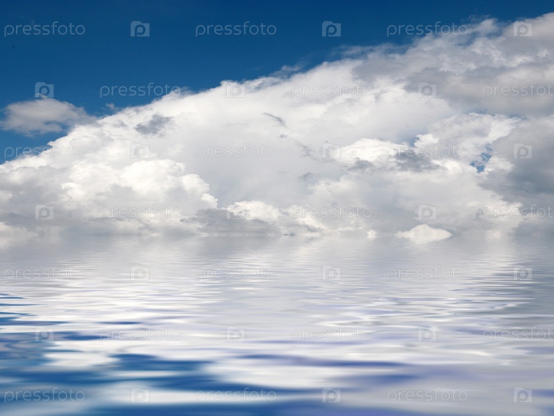 Облака в небе, ярко освещенные солнцем и спокойная гладь океана