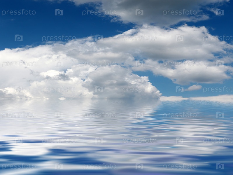 Облака в небе, ярко освещенные солнцем и спокойная гладь океана