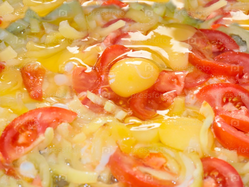 Красивый процесс приготовления яичницы со спелыми помидорами