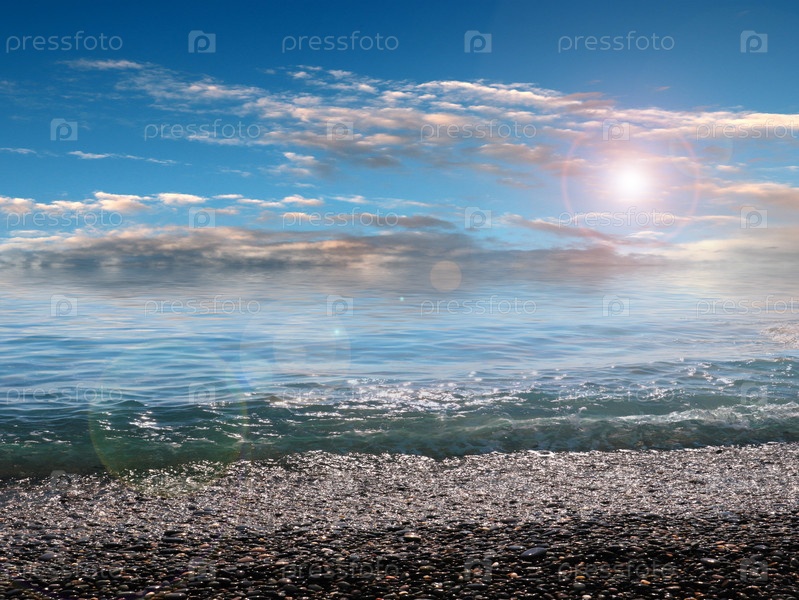 Чистая морская волна падает на галечный пляж в солнечный день