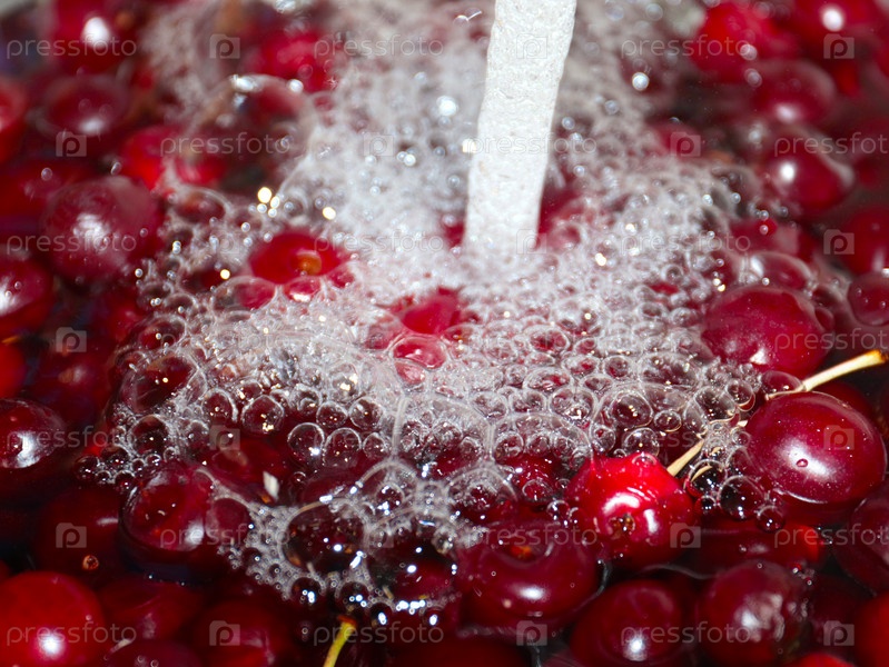 Поток чистой прозрачной воды и букет красных спелых вишен