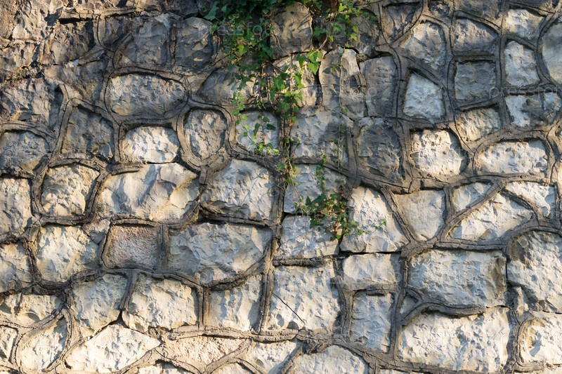 Текстура старой каменной стены с плющом и освещенная солнечным светом