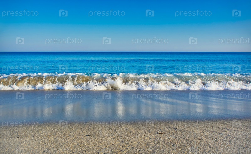Морской пейзаж с ясным голубым морем, безоблачным небом и белым песчаным пляжем