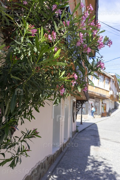 Куст розового олеандра на фоне размытой улицы. Гурзуф, Крым