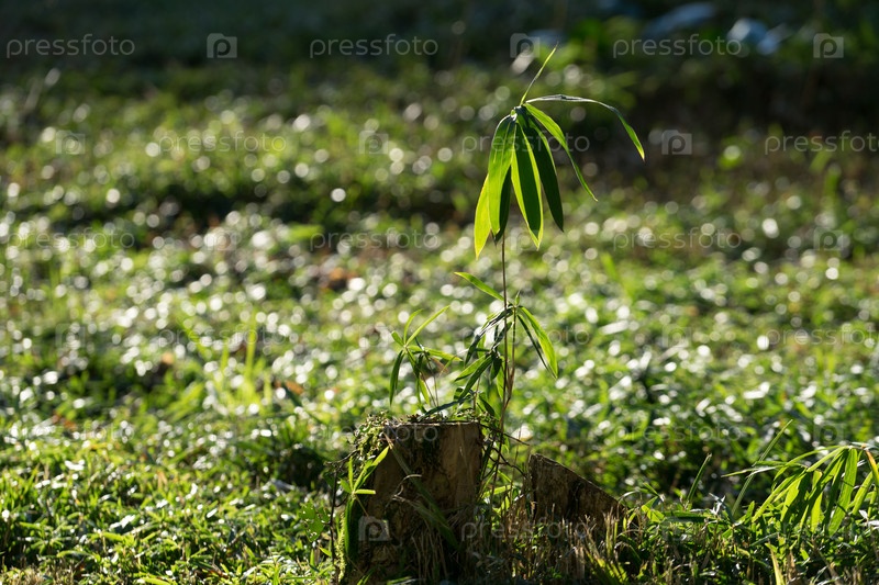 Маленькая веерная пальма на фоне травы