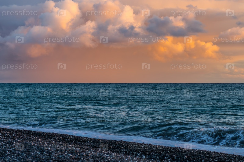 Волшебное бледно-розовое небо с пушистыми красочными облаками на закате и море