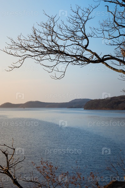 Пейзаж с сухим деревом на фоне моря