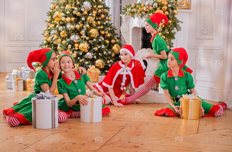Группа веселых счастливых детей-девочек-подружек в костюмах эльфов и Санты с подарками на фоне елки