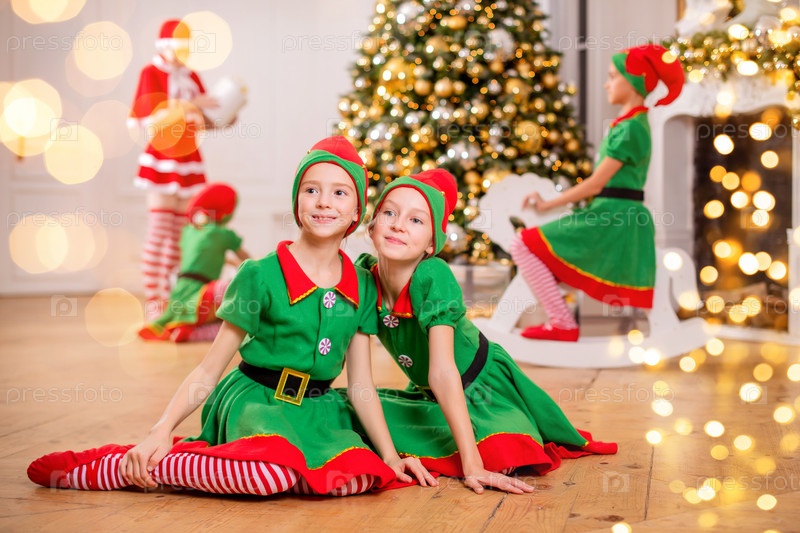 Две веселые счастливые подружки в костюмах эльфов Санты на фоне елки и других детей