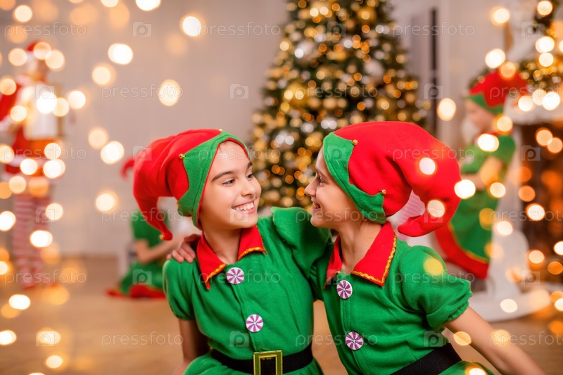 Две веселые счастливые подружки в костюмах эльфов Санты на фоне елки и других детей