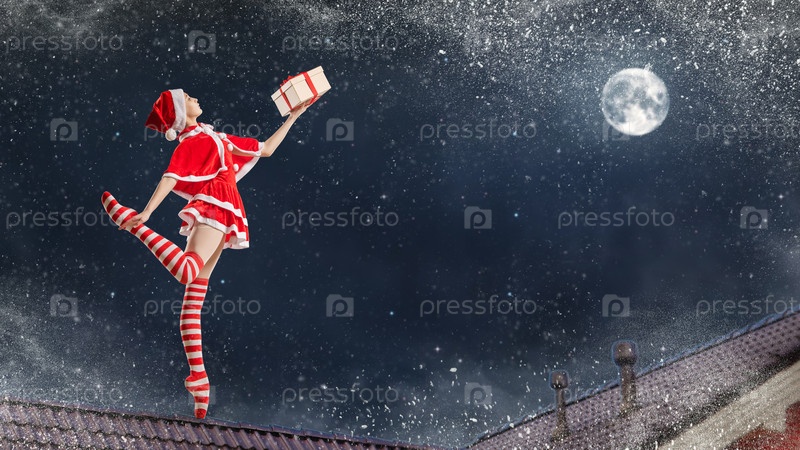 Танцующая балерина с подарком в руках в костюме Санта-Клауса на крыше дома в рождественскую ночь на фоне звездного неба