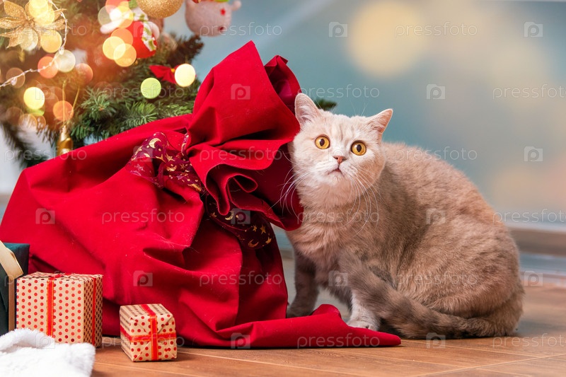 Серый британский кот с желтыми глазами рассматривает подарочные коробки под елкой в гостиной