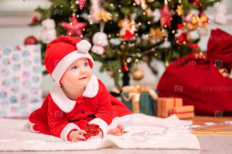 Очаровательный ребенок в костюме Санта-Клауса играет возле украшенной елки в гостиной