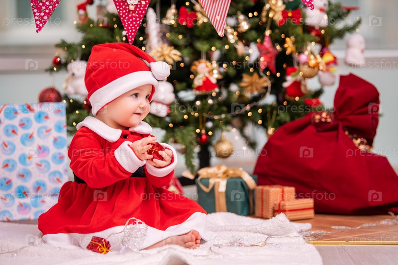 Очаровательный ребенок в костюме Санта-Клауса играет возле украшенной елки в гостиной