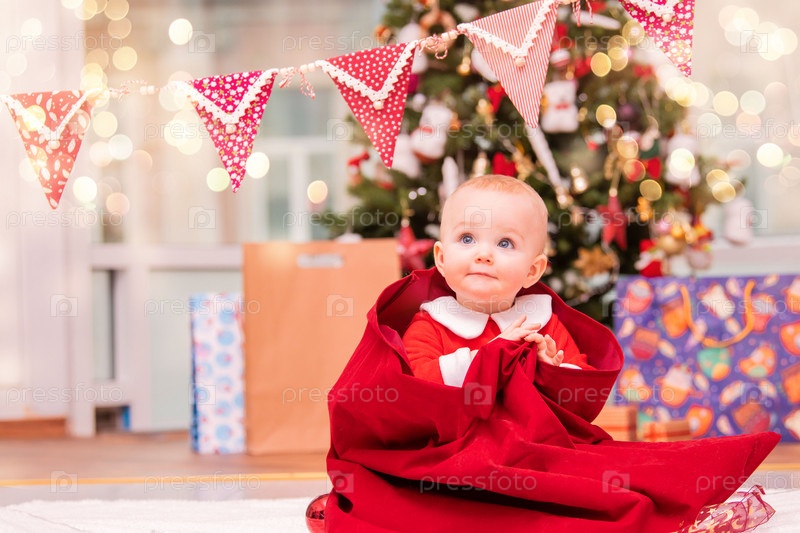 Очаровательный малыш в костюме Санты выглядывает из рождественского мешка Санта-Клауса в украшенной гостиной с рождественской елкой