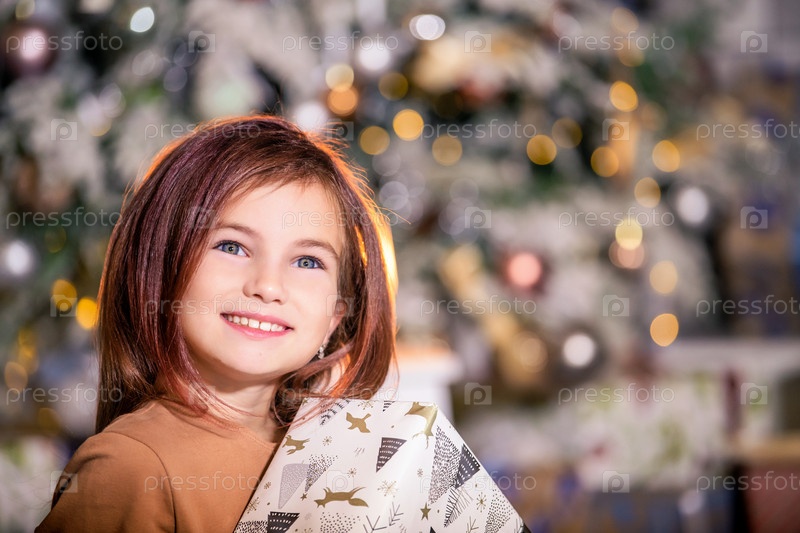 Портрет улыбающейся девушки с хитрым планом на фоне елки с подарком в руках