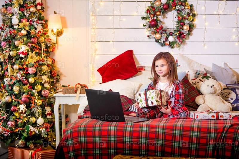 Девушка с рождественским подарком в руках сидит в пижаме на кровати напротив ноутбука в украшенной спальне