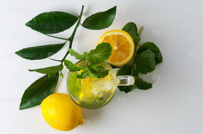 Стакан воды с ломтиками лимона, листьями мяты и кубиками льда. Безалкогольный охлажденный напиток. Вид сверху