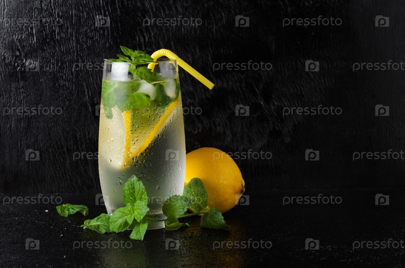 Стакан лимонада с соломинкой на черном текстурированном фоне