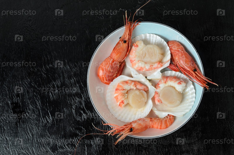 Натуральный сырой гребешок с вареными креветками в раковине в керамической миске на темном фоне