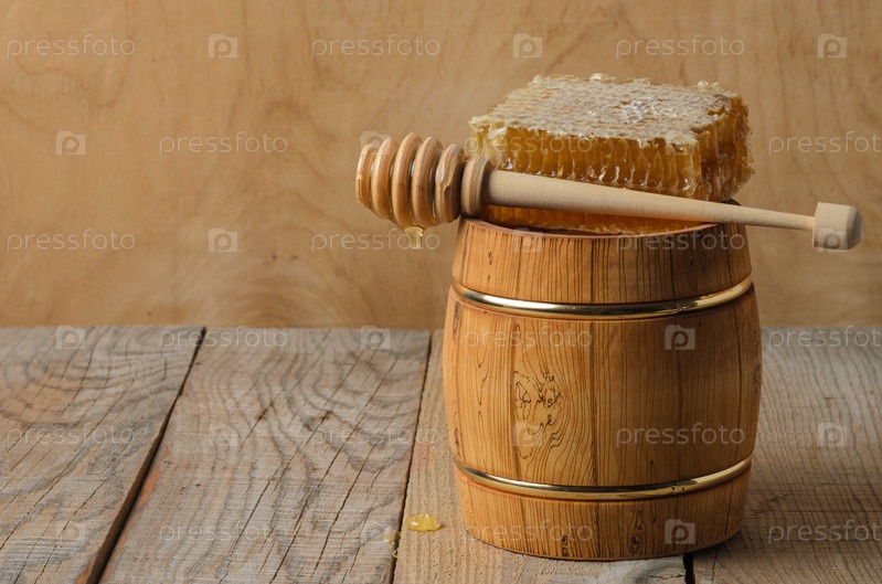 Деревянная бочка с медом, мед в сотах с деревянной ложкой и капли на столе