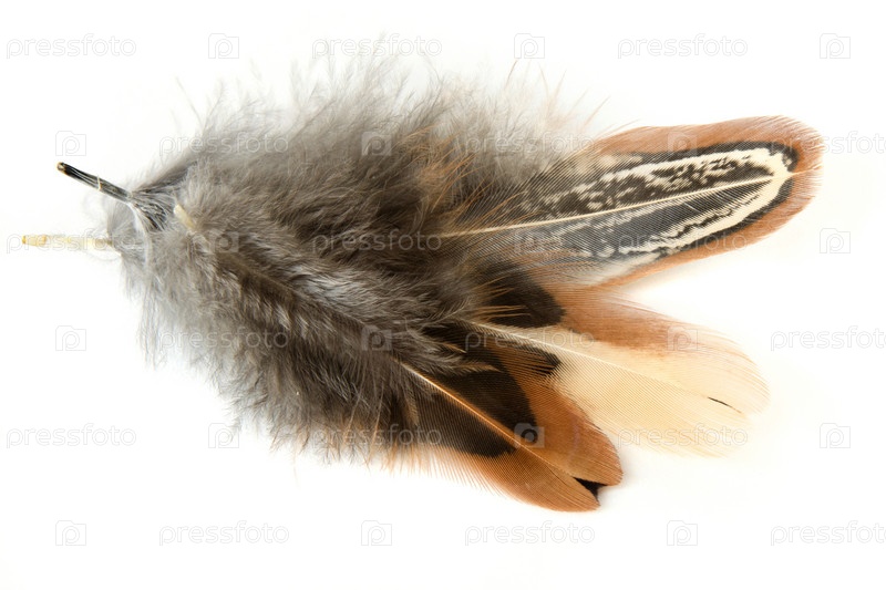 Три светлых красивых разноцветных пера на белом фоне с тенью
