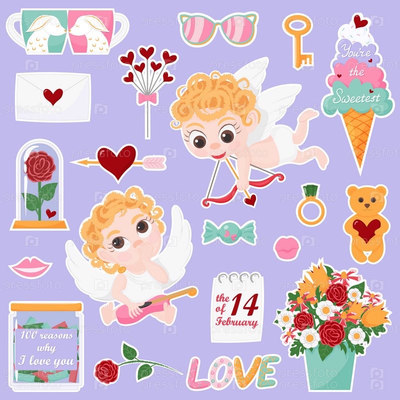 Набор милых рисованных мультяшных наклеек на тему Дня Святого Валентина, свадьбы. Векторные иконки