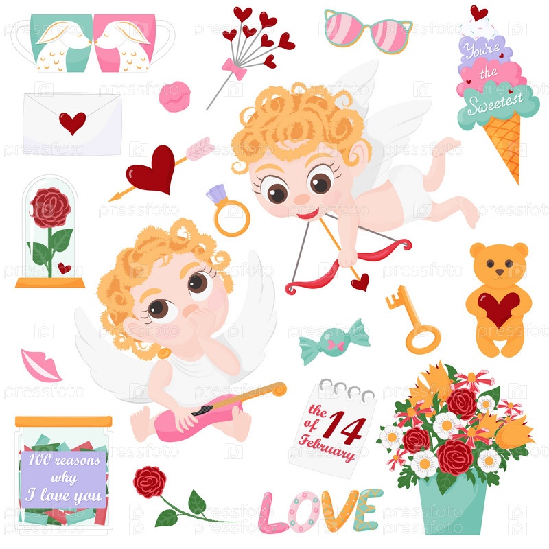 Векторная мультяшная иллюстрация, фон для свадьбы, День святого Валентина: ключи, сердца, амуры, конфеты, поцелуи, кольца, розы, мороженое, банка с записками, любовные послания