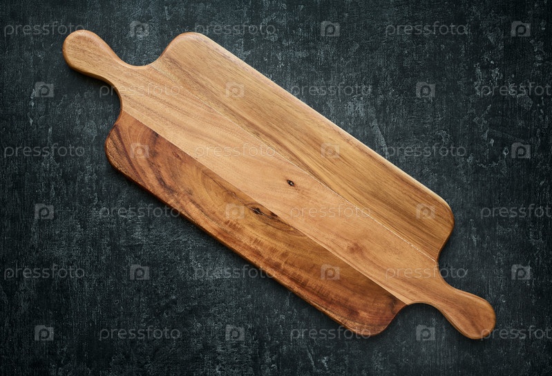 Длинная деревянная доска на сером фоне. Вид сверху