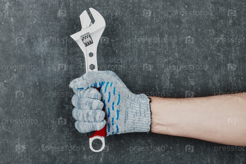 Мужская рука держит разводной гаечный ключ на сером фоне, мужская рука в перчатках